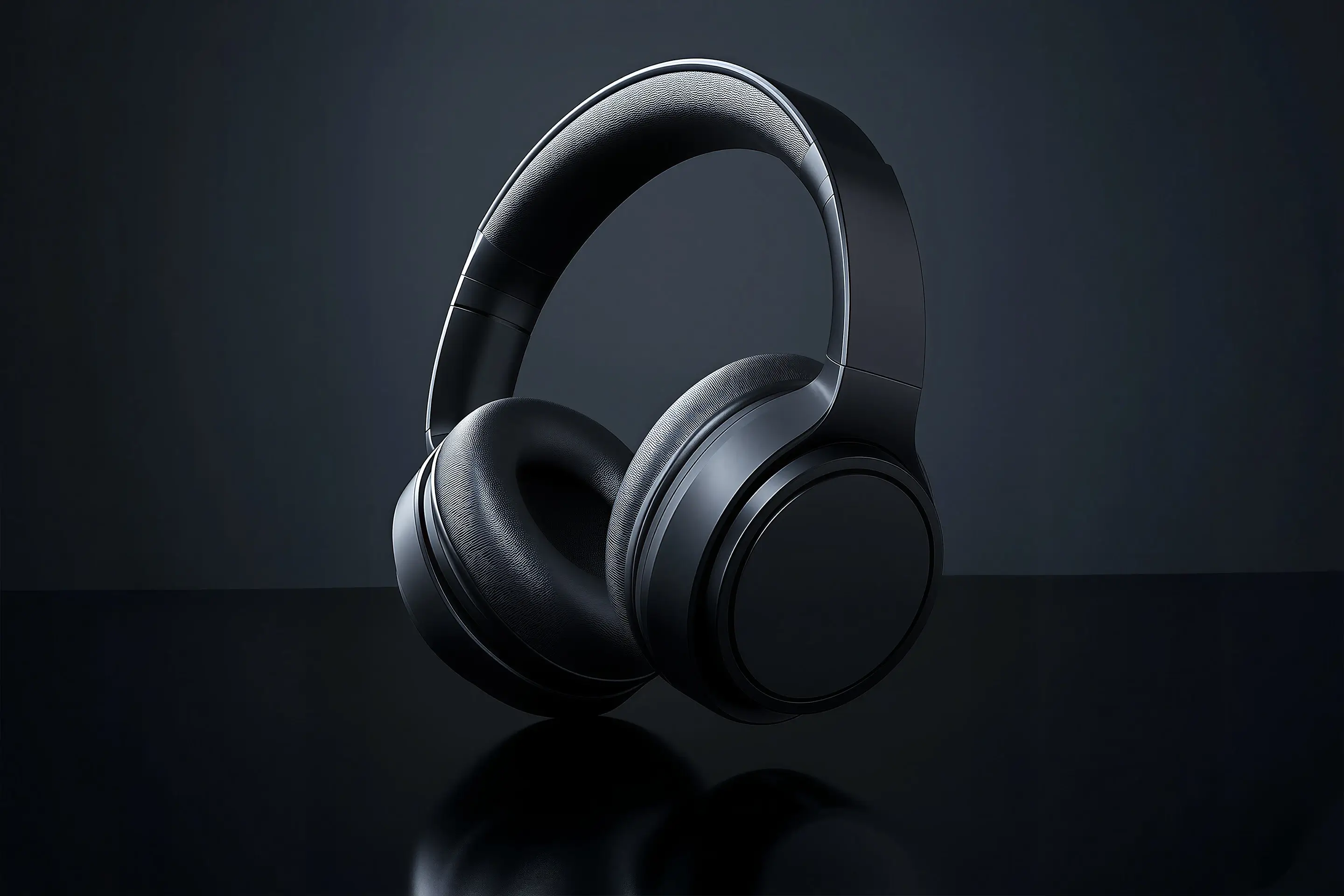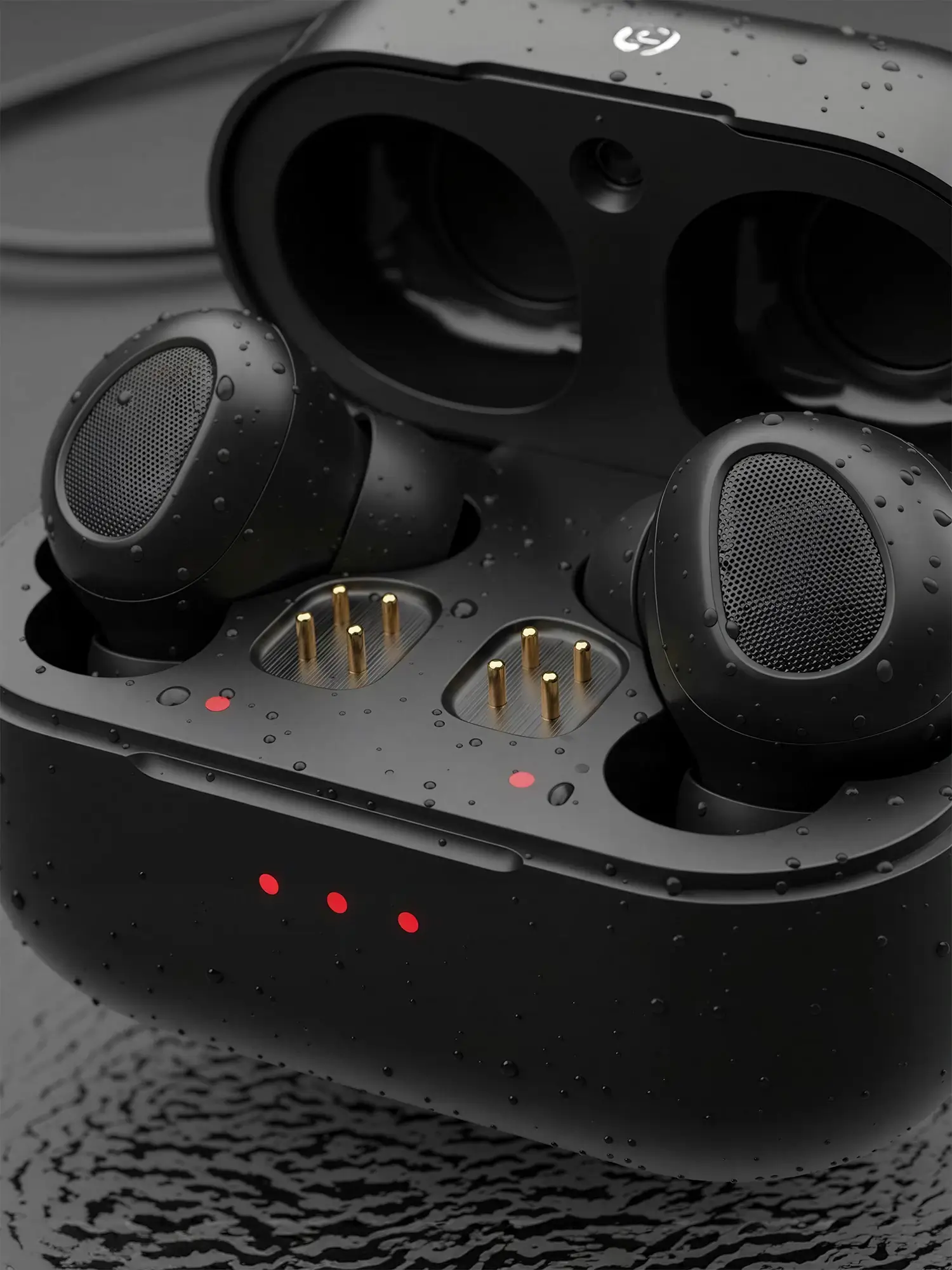 Premium product hero with soft reflections, technical precision, and tactile blacks crafted for a next-gen wireless earbuds launch marketing suite.