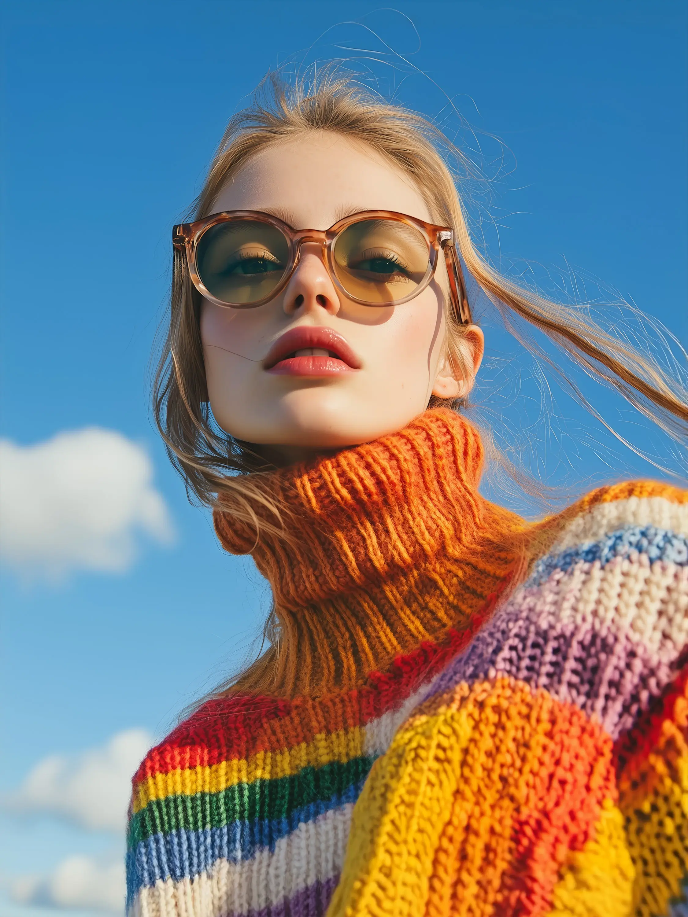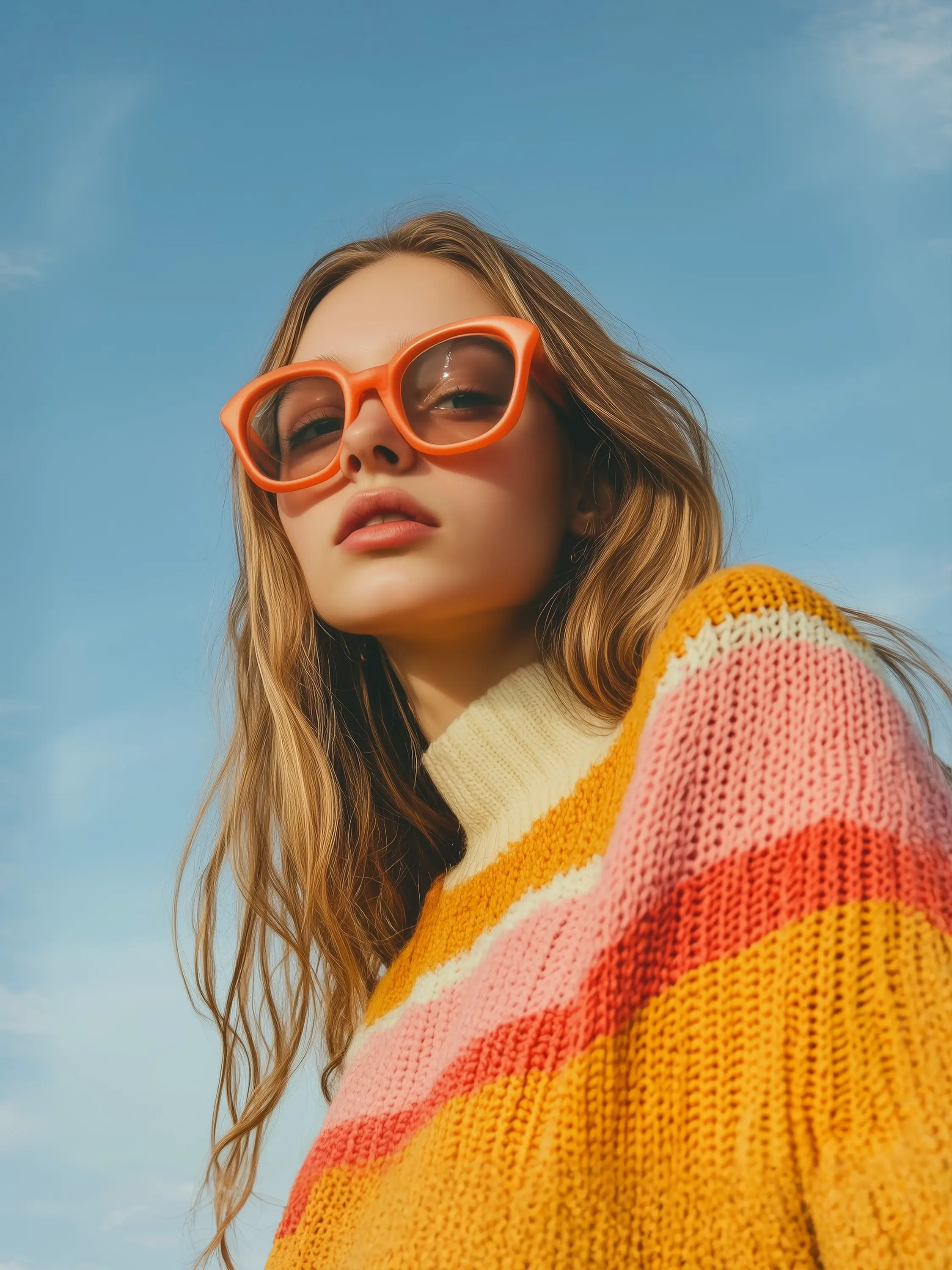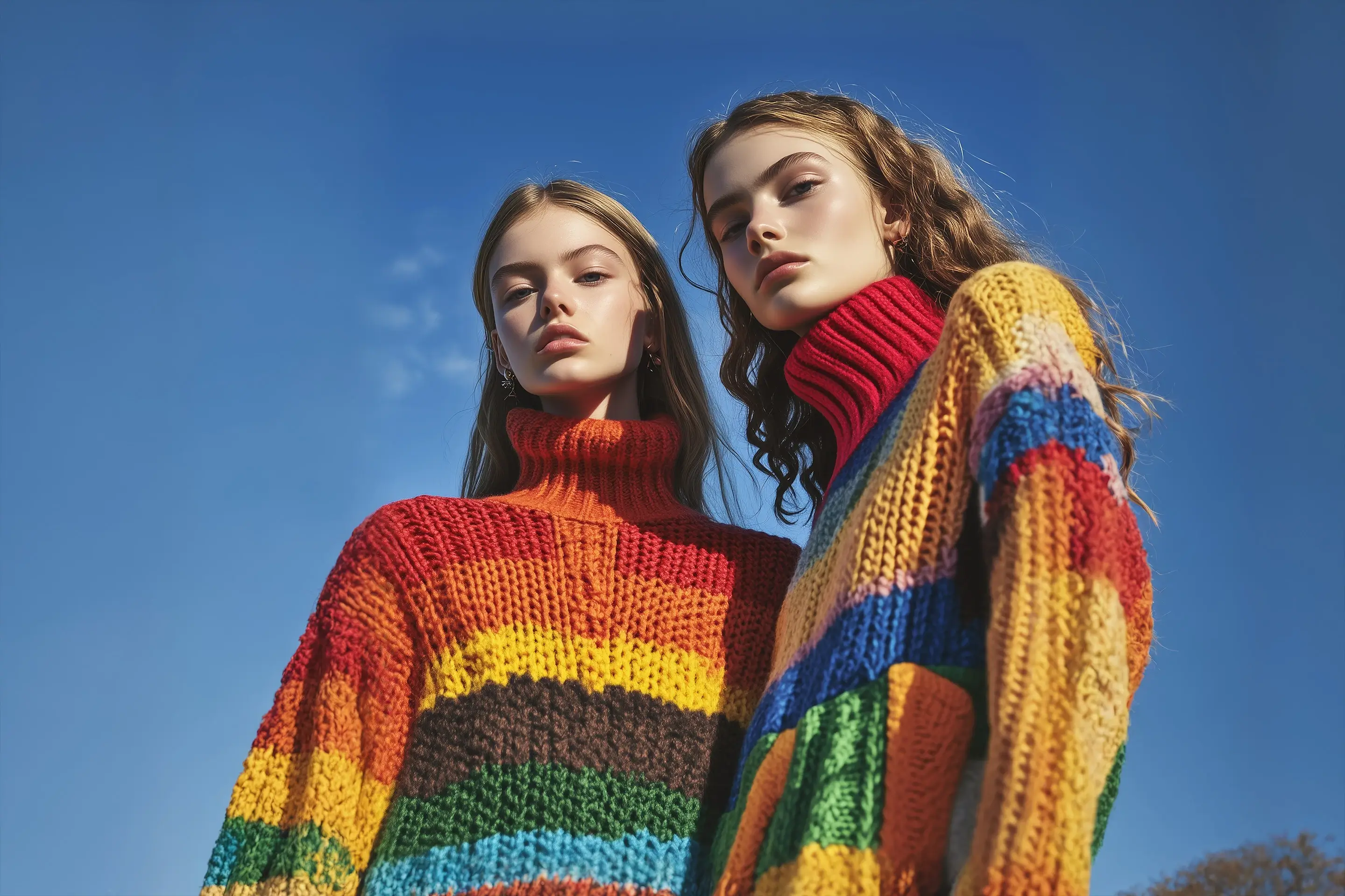 Editorial fashion portrait celebrating friendship, pattern play, and airy daylight for a resortwear lookbook with global warmth brand storytelling set.