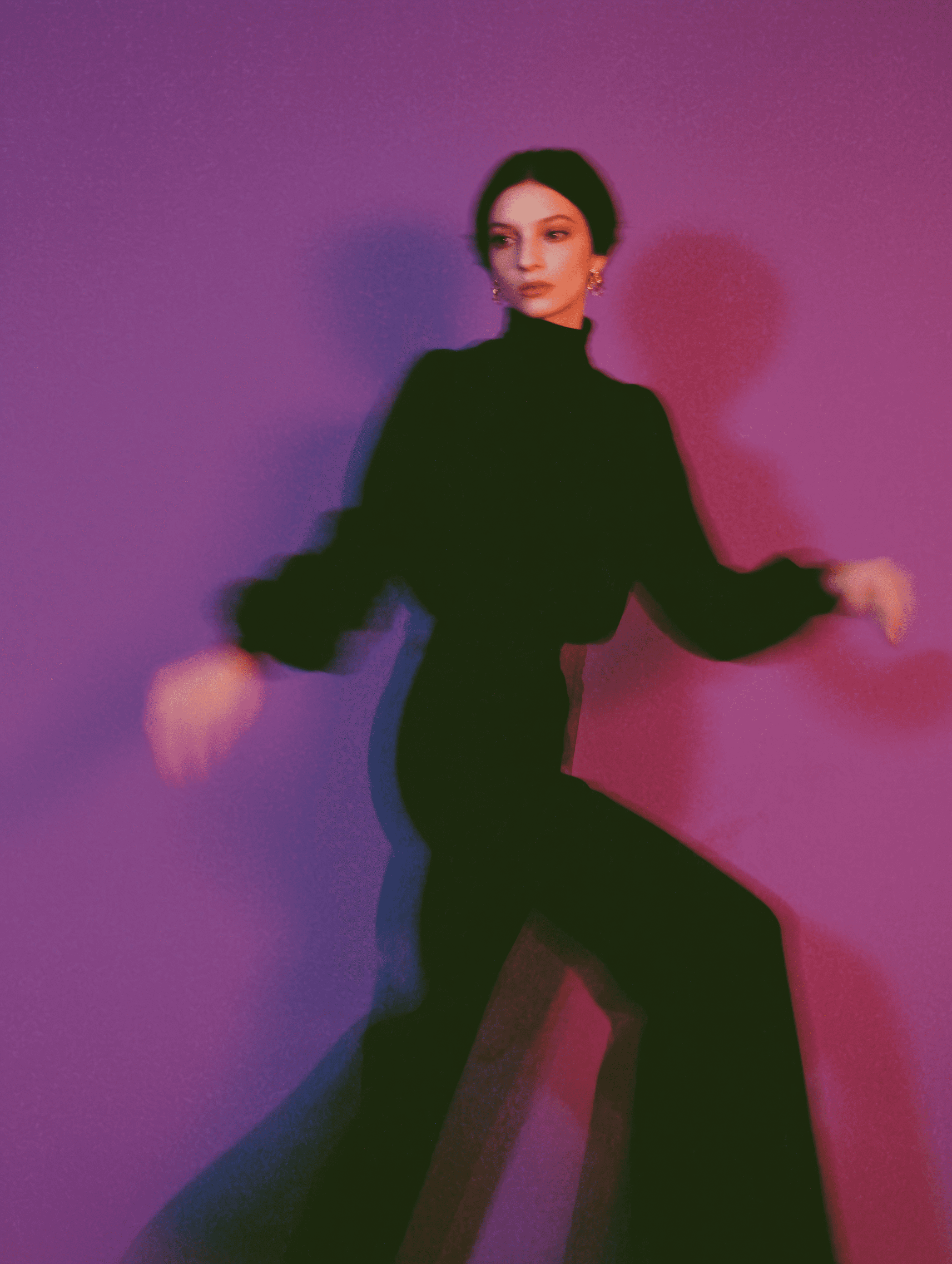 Abstract dance portrait with painterly motion blur, neon accents, and expressive choreography for a contemporary performance piece poster and trailer.