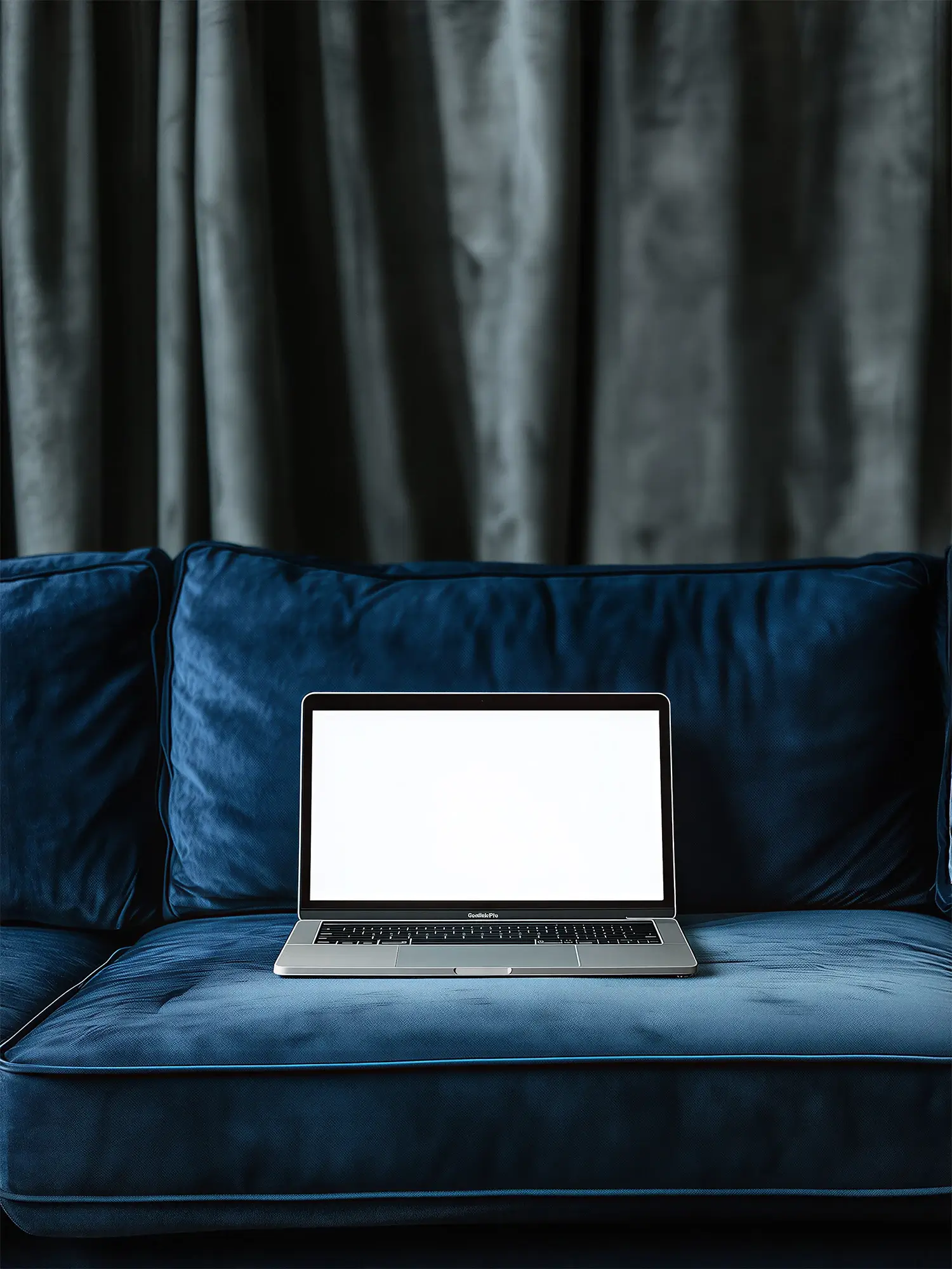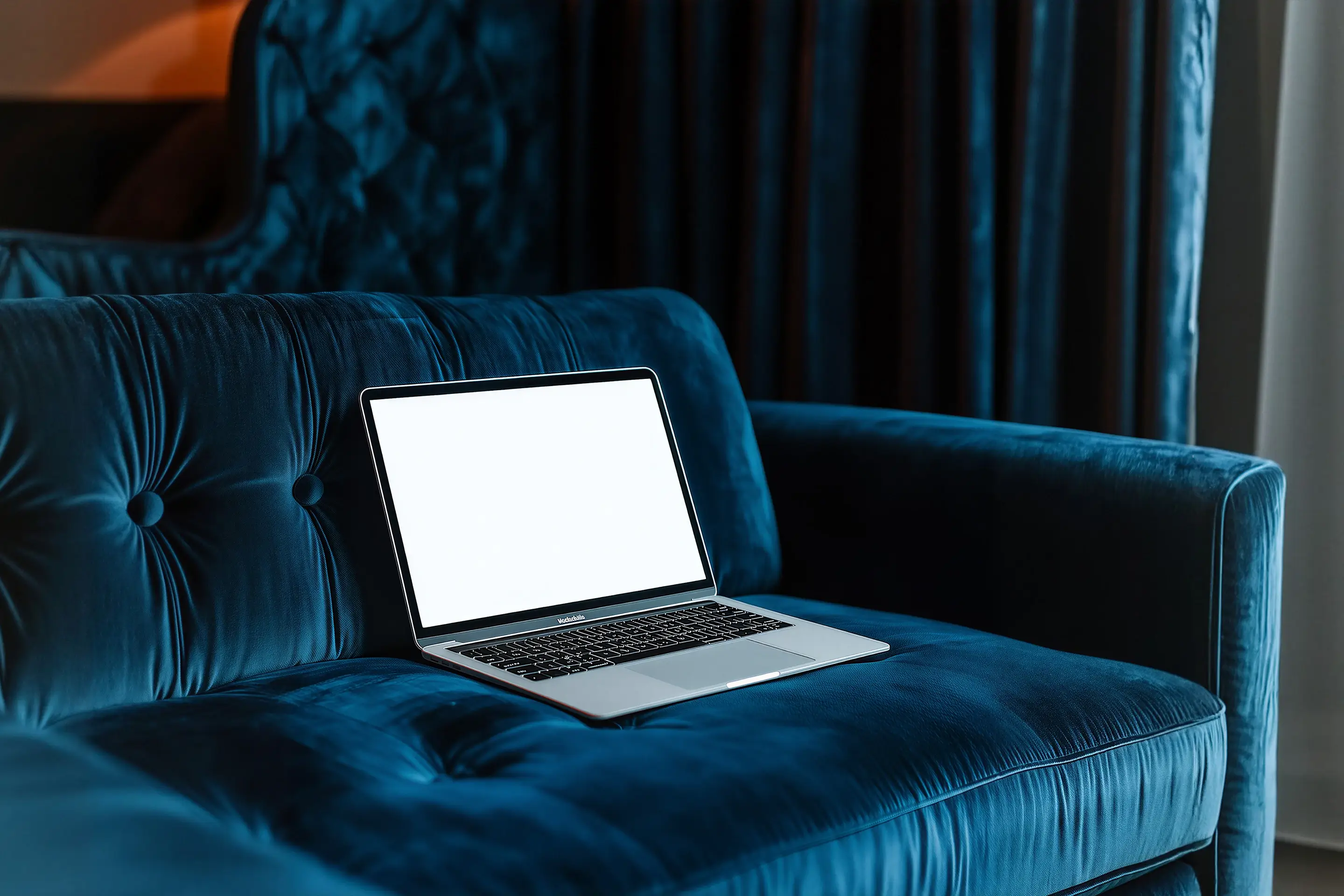 Moody workspace scene with ambient blues, screen glow, and tactile upholstery designed for a productivity app brand film launch sequence.