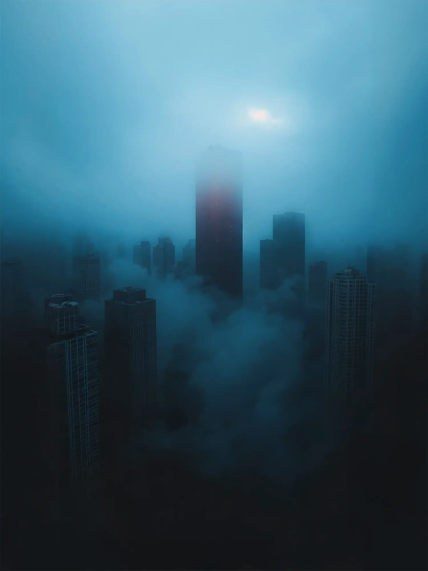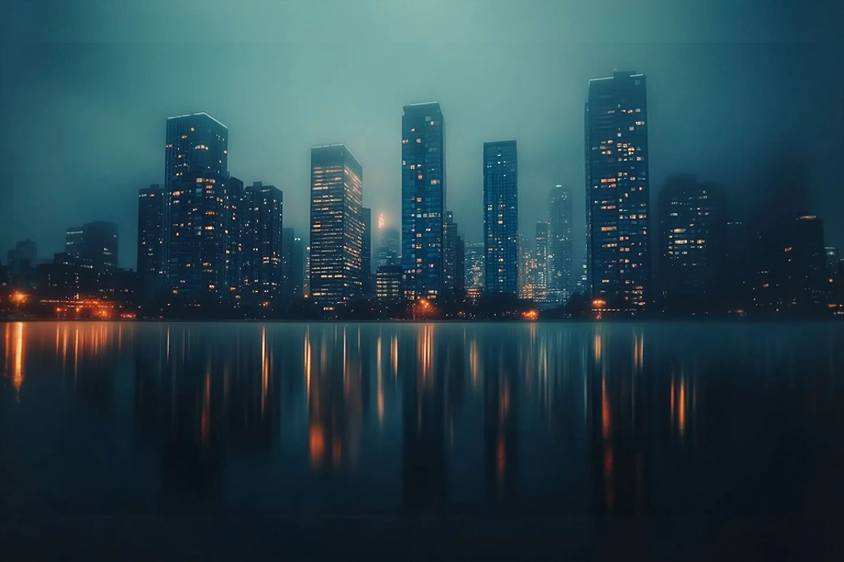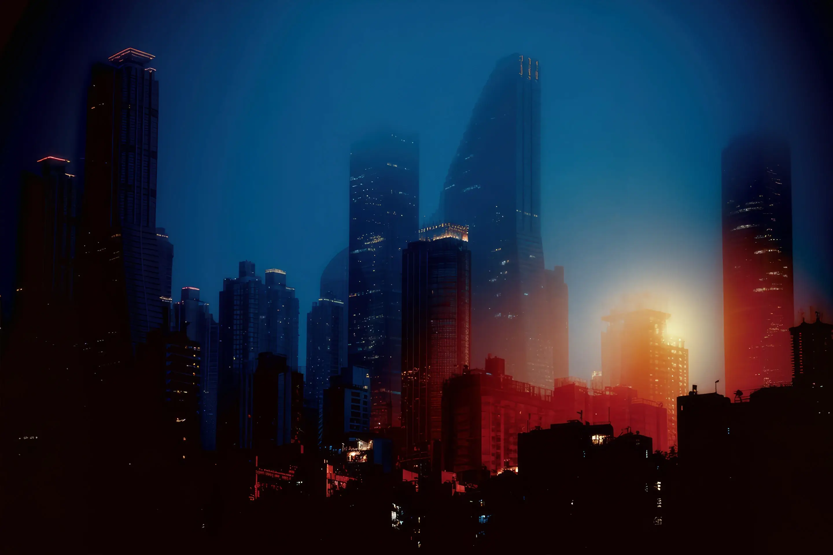 Atmospheric cityscape balancing moody blues and ember highlights, crafted to frame a technology firm's urban innovation narrative keynote backdrop suite.