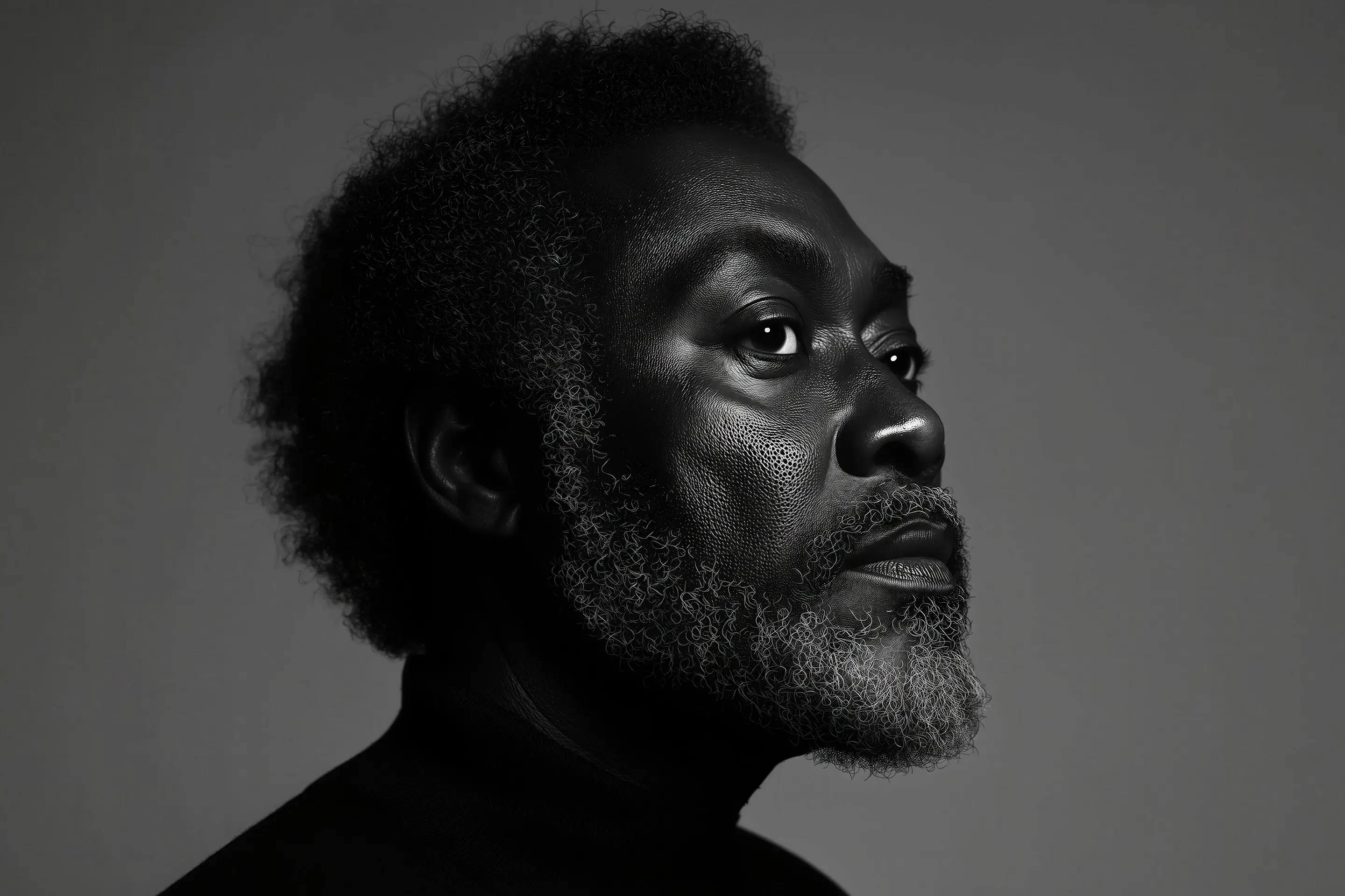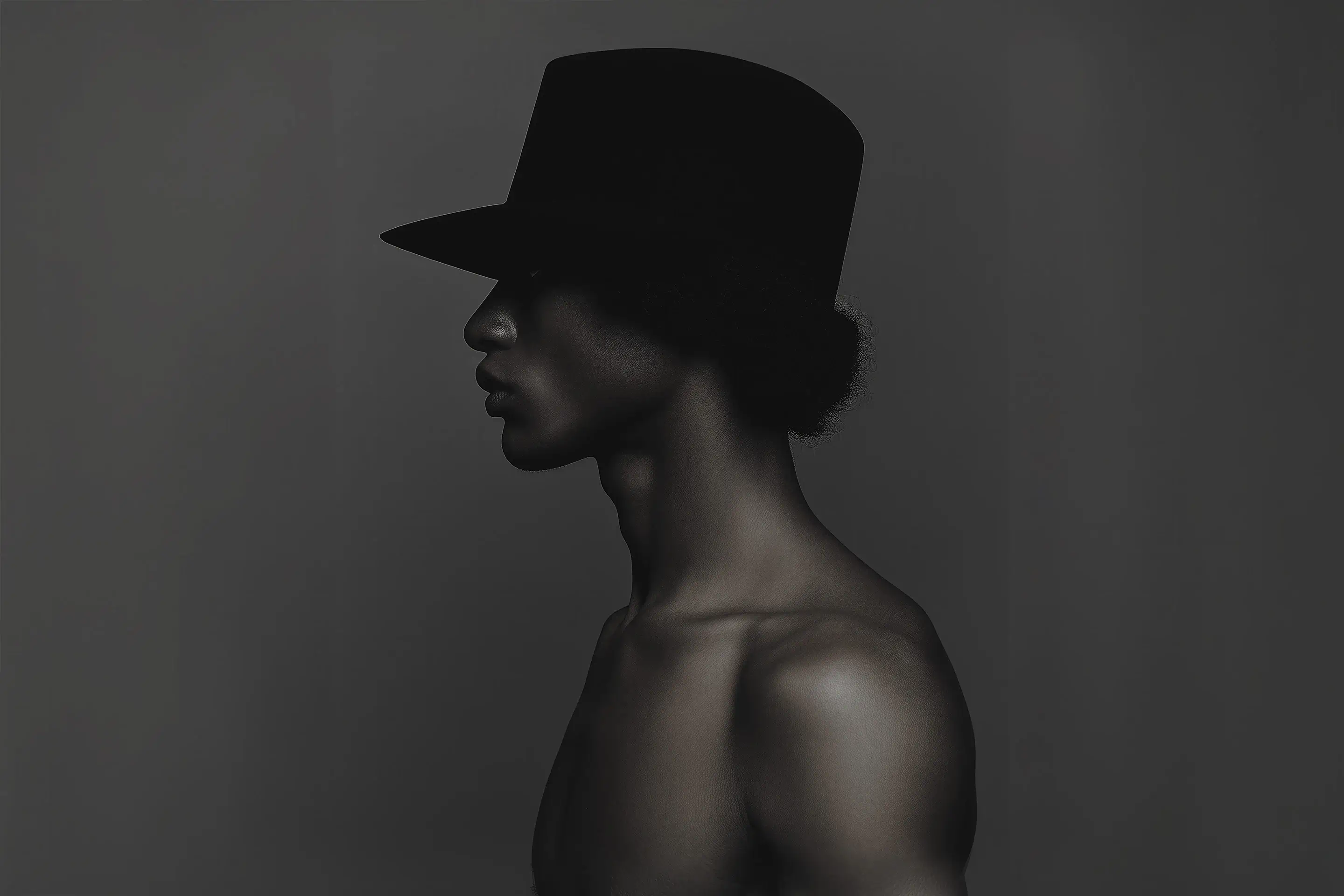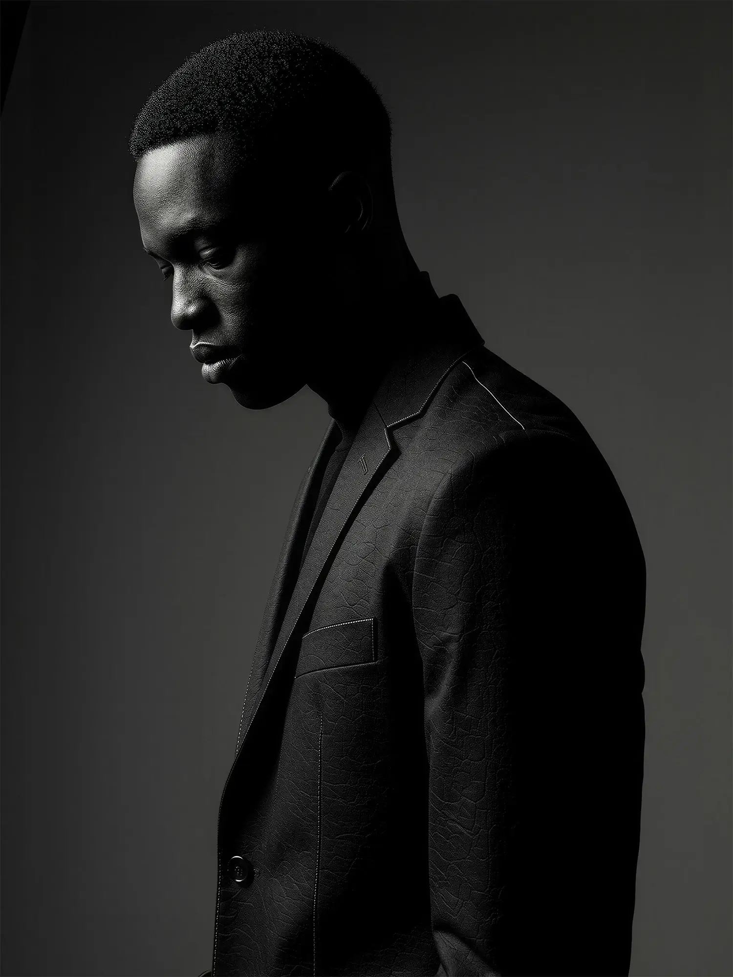 Stylized profile with shadow play, minimalist wardrobe, and cinematic grain created for a menswear capsule and brand teaser campaign imagery.